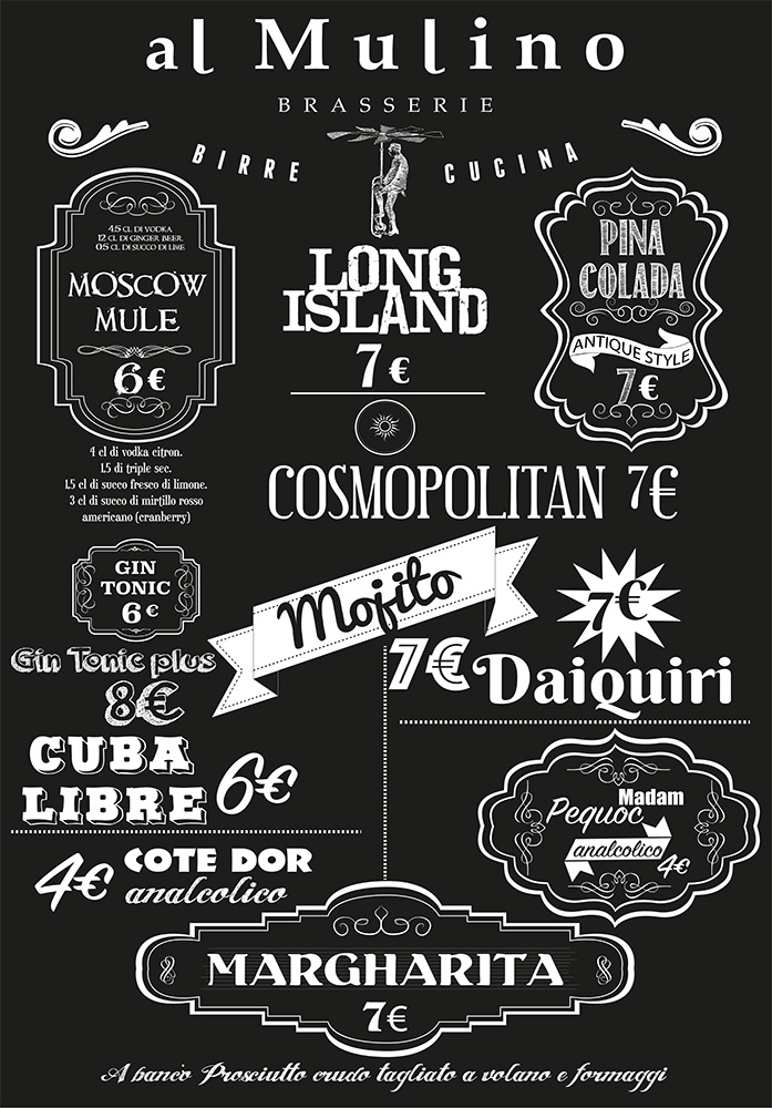 Benvenuti alla Brasserie al Mulino, chiudete gli occhi e assaporate le nostre eccellenze, dai piatti prelibati alle migliori birre artigianali. Sorseggiate lentamente un cocktail dall’eco internazionale. Lasciatevi avvolgere dalle luci soffuse e da un’atmosfera unica, sospesa tra il presente e un magico passato. Un luogo ricco di fascino, dove la storia abbraccia la buona tavola e il piacere della convivialità.